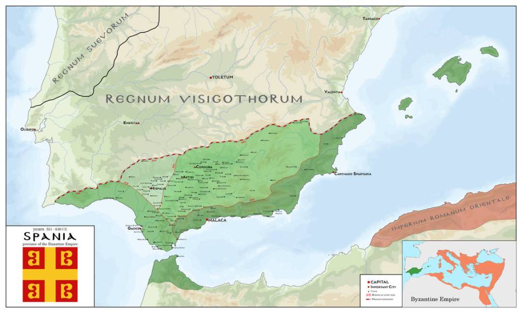 Tras la caída del Imperio Romano de Occidente, la Península Ibérica se convirtió en un mosaico de poderes, con diferentes pueblos y culturas luchando por el control del territorio. En este contexto, el emperador bizantino Justiniano I intentó recuperar parte del antiguo Imperio Romano, estableciendo la provincia de Spania en el siglo VI. Sin embargo, el control bizantino fue limitado, concentrándose principalmente en la costa sur de la península.